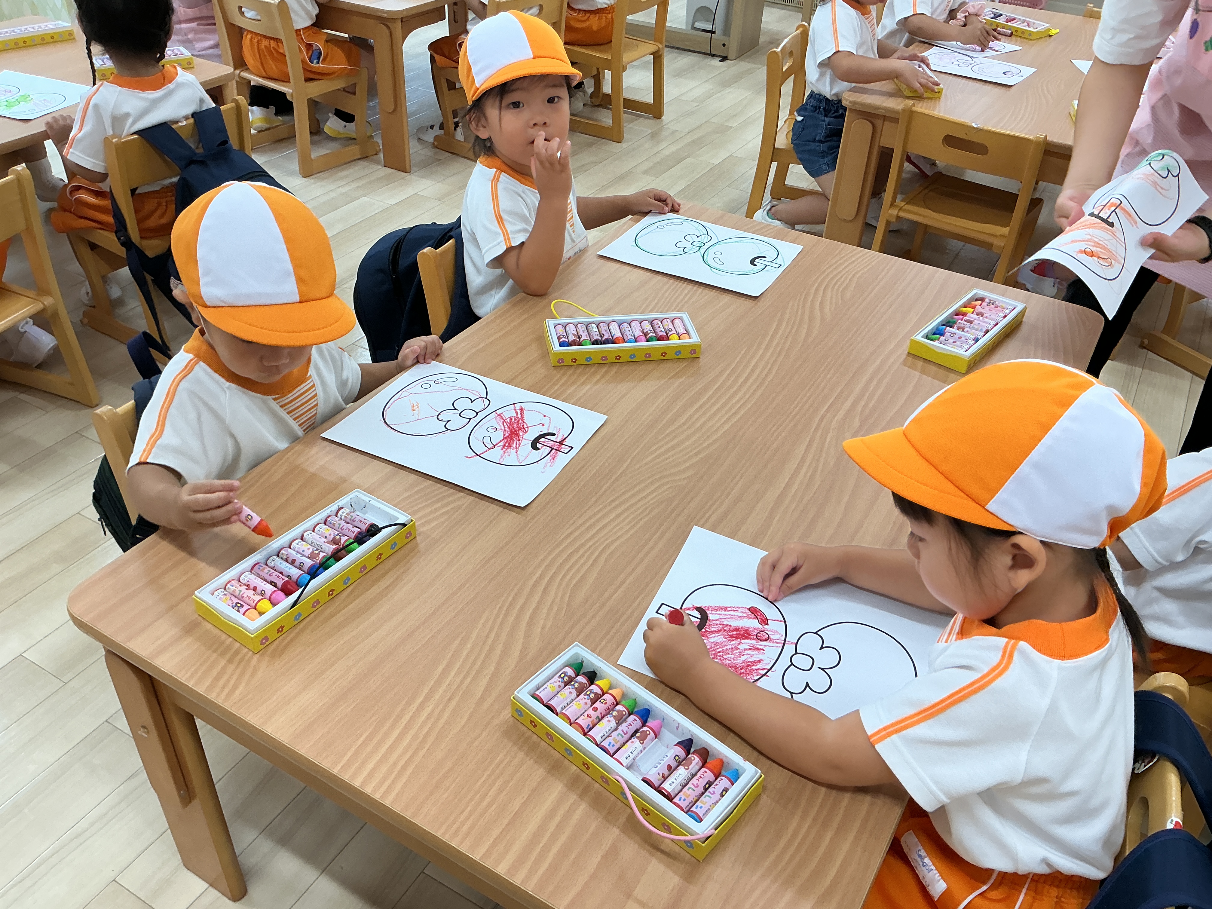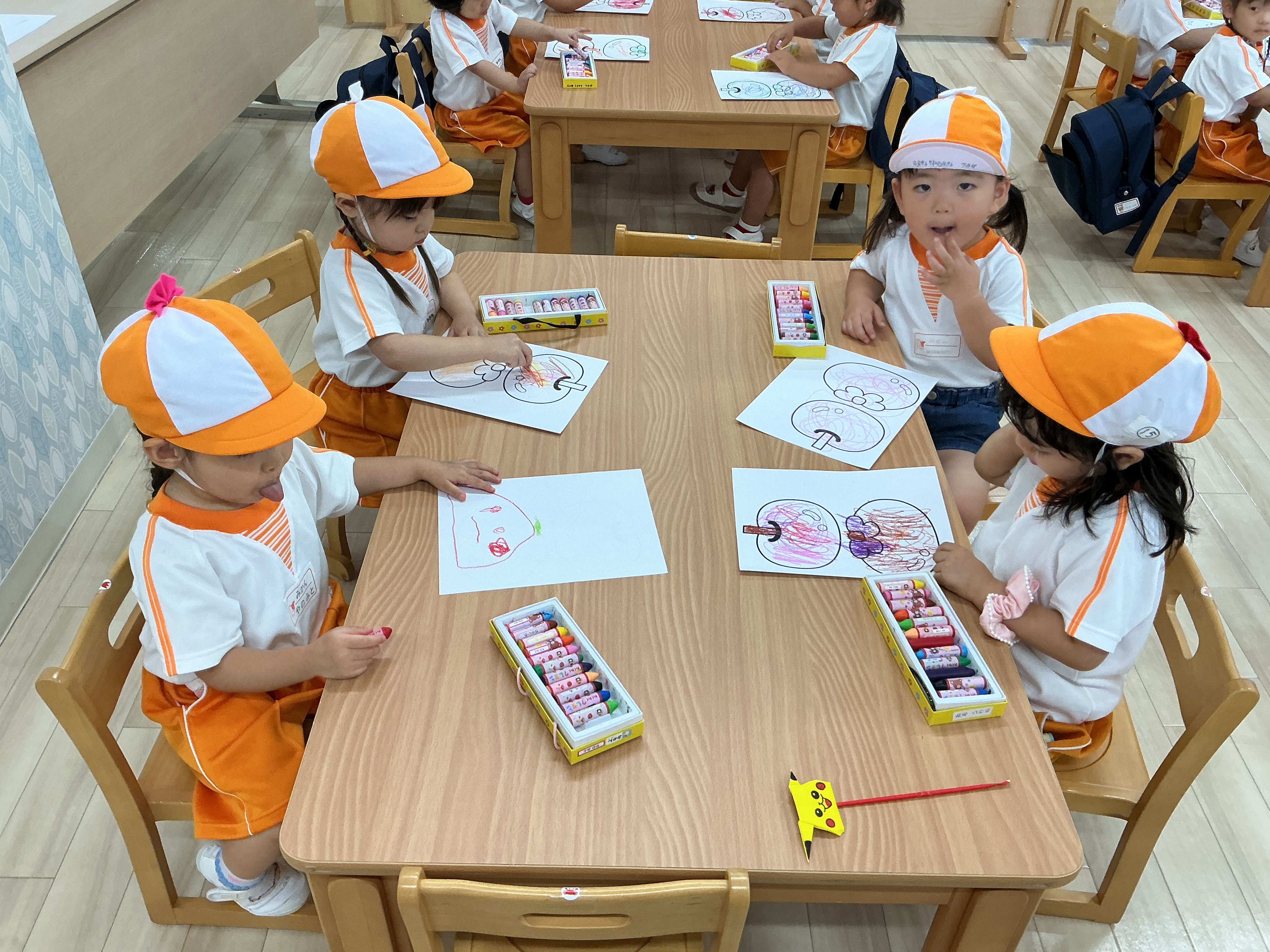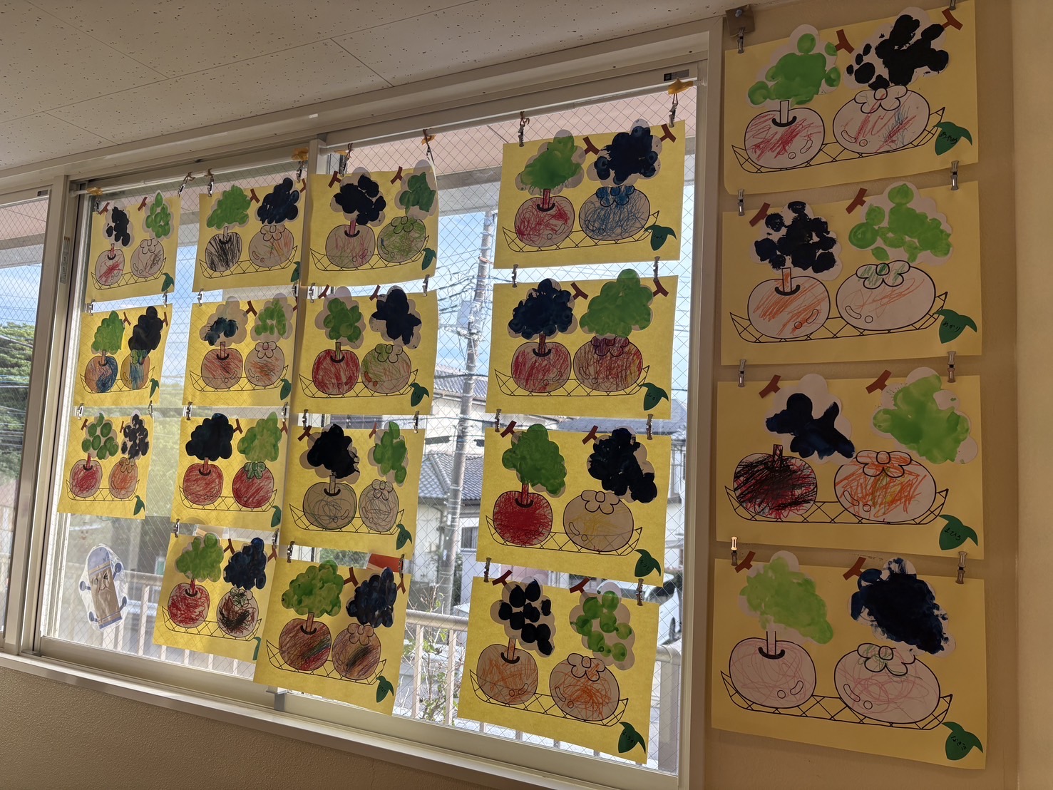 クレヨンでも、秋に美味しい果物の制作をしました。どんな果物があるかな?絵本をみてから、柿とりんごの塗りつぶしや、たんぽ筆で2種類のぶどうを描きました。『おいしくなあれ!』と言いながら心を込めて作りました。