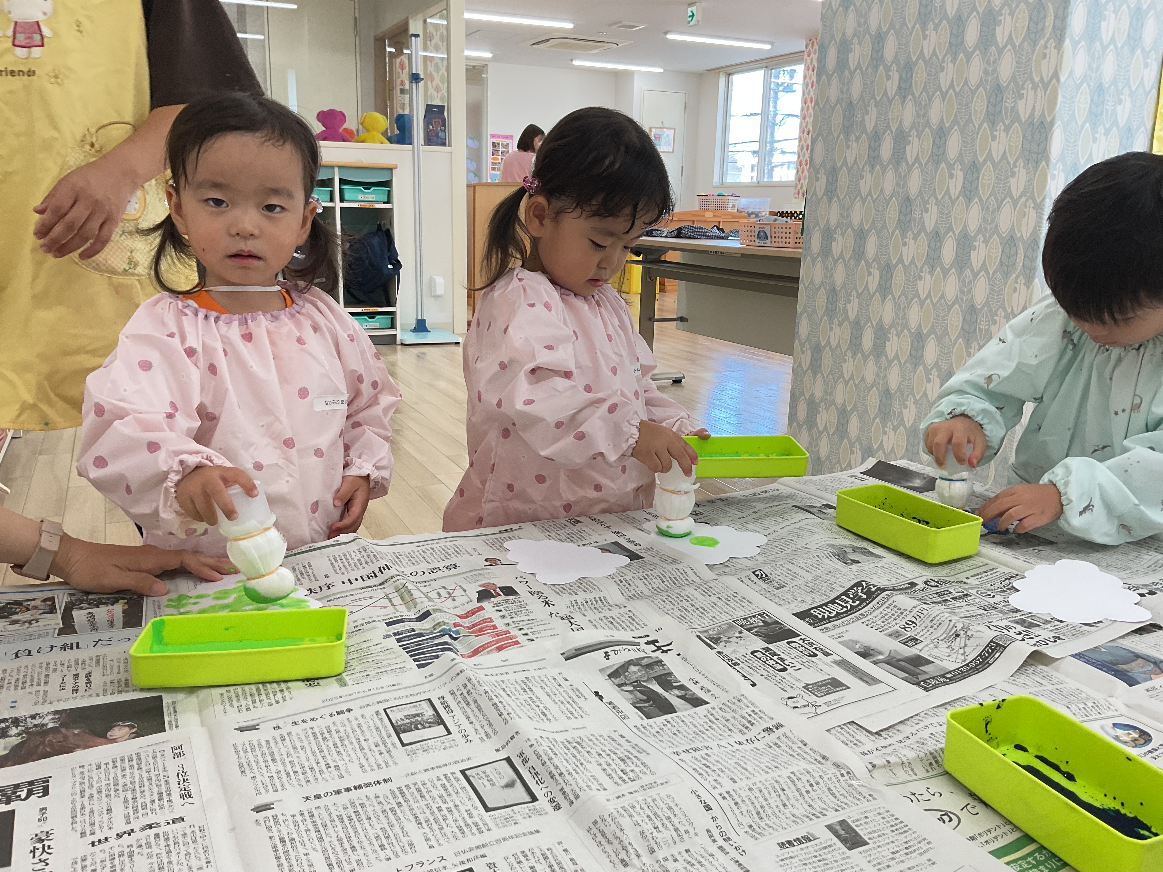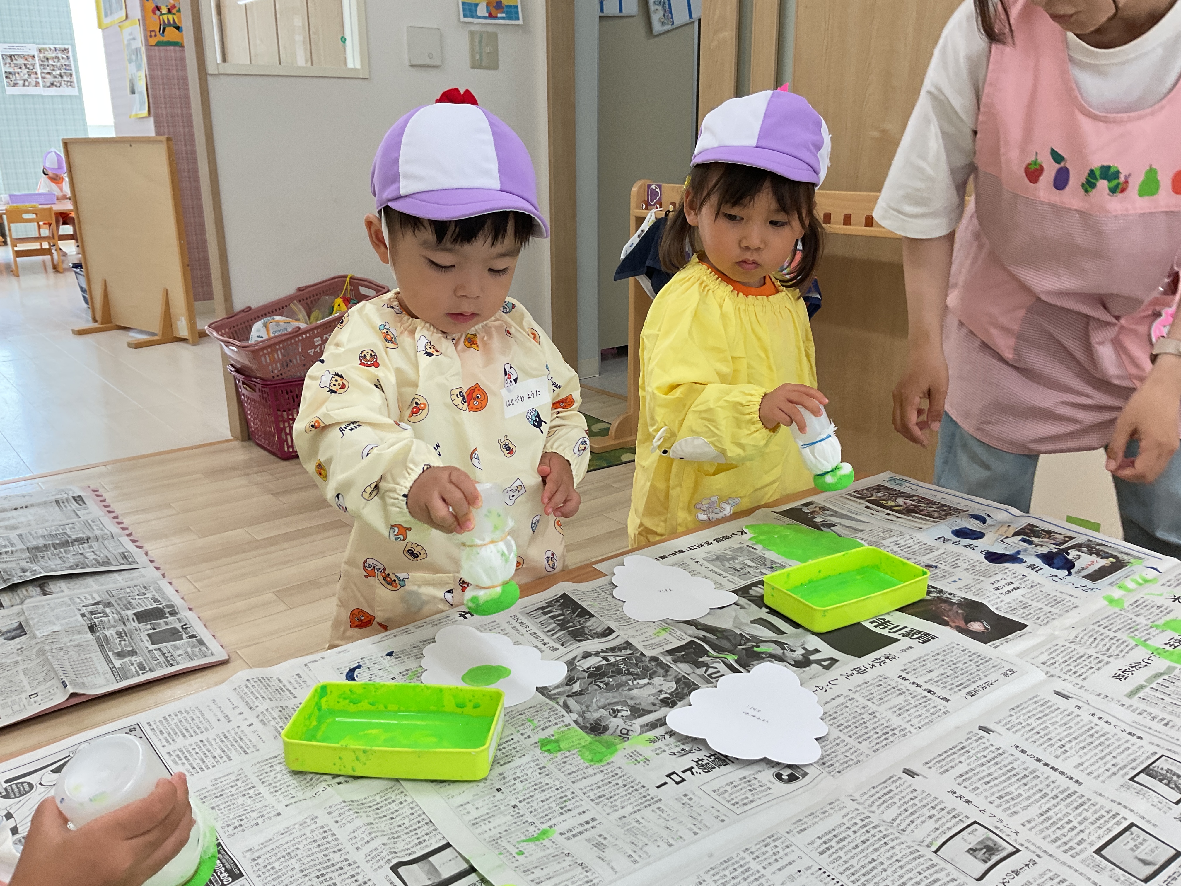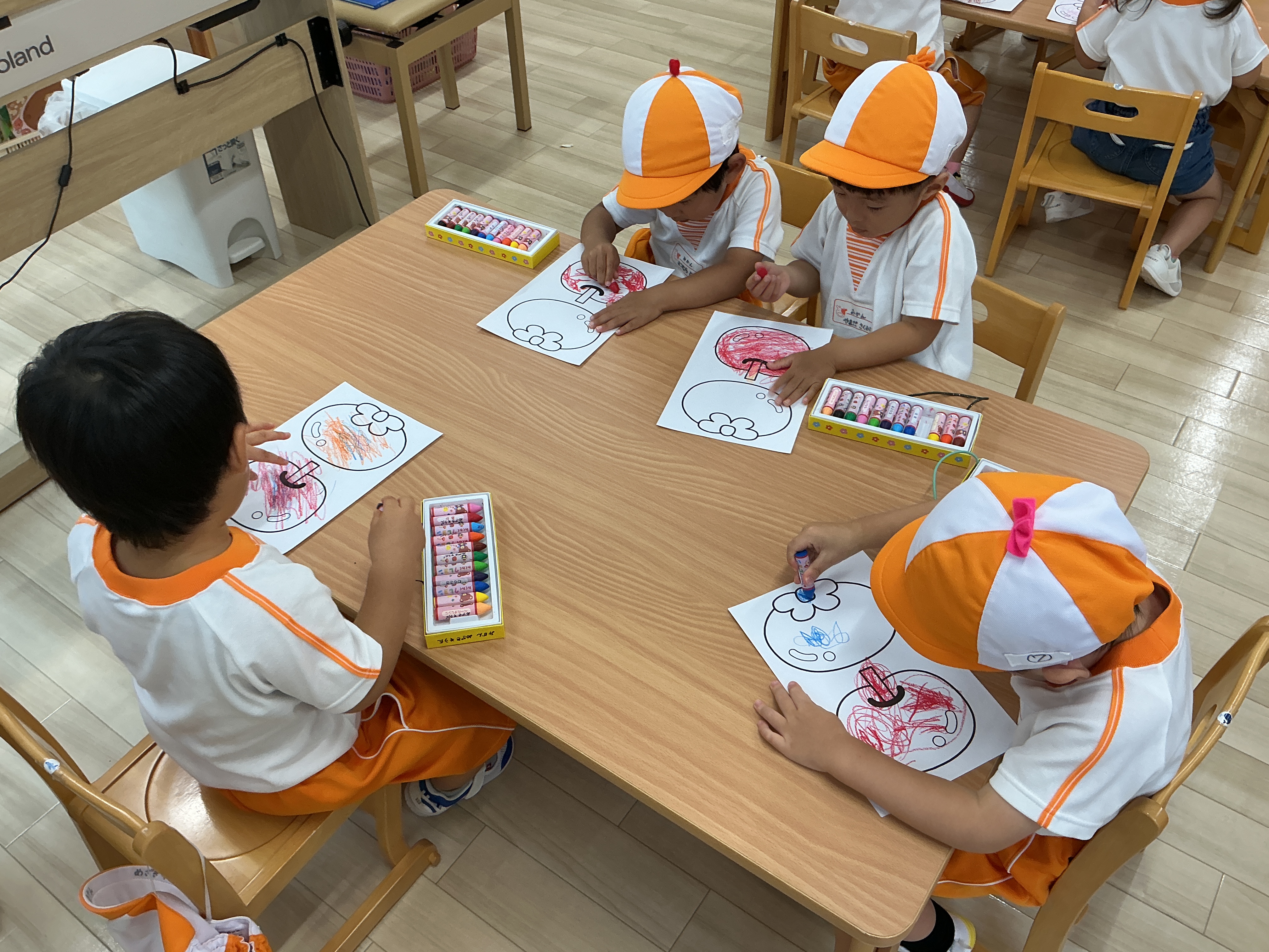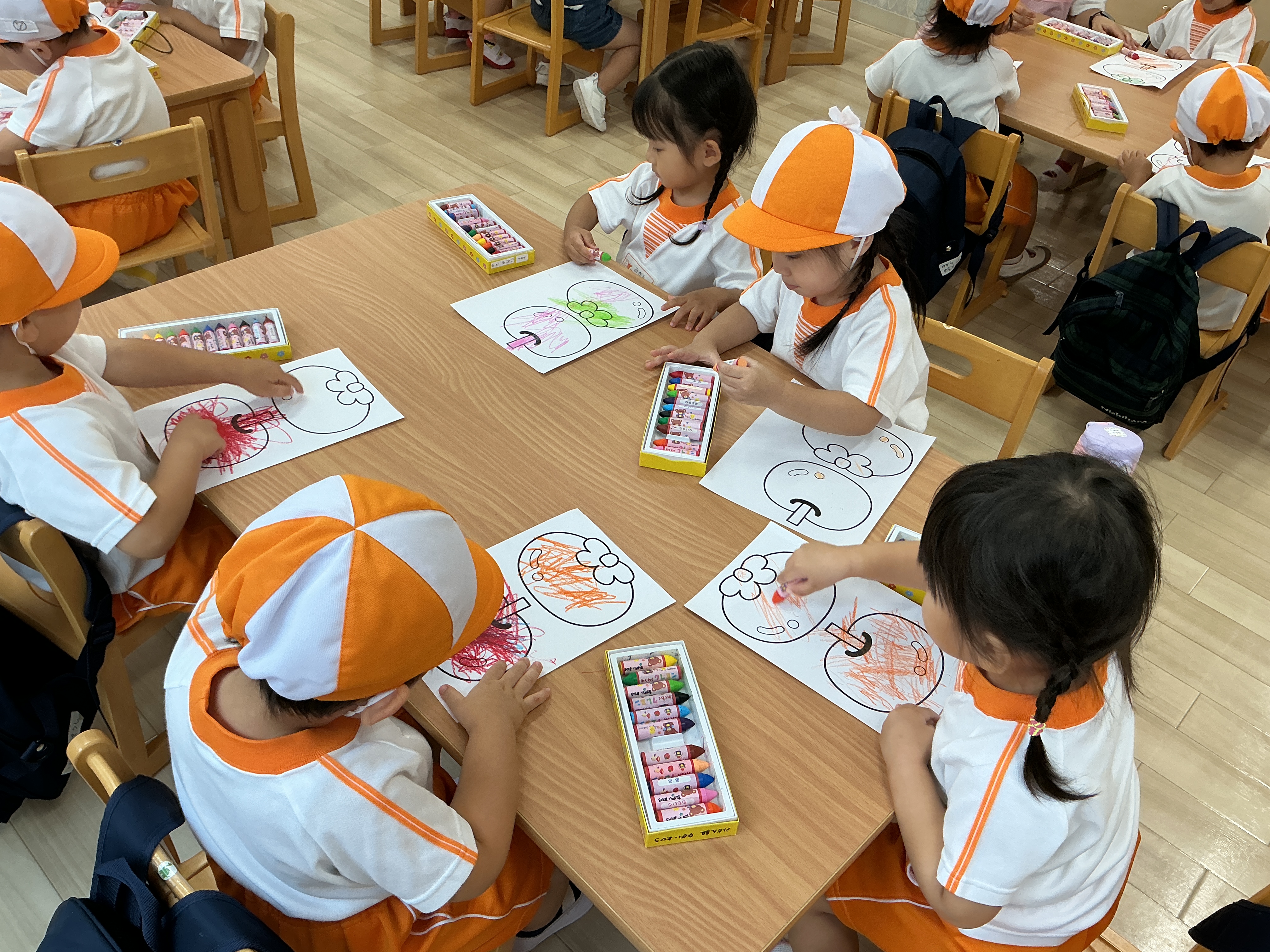 クレヨンでも、秋に美味しい果物の制作をしました。どんな果物があるかな?絵本をみてから、柿とりんごの塗りつぶしや、たんぽ筆で2種類のぶどうを描きました。『おいしくなあれ!』と言いながら心を込めて作りました。
