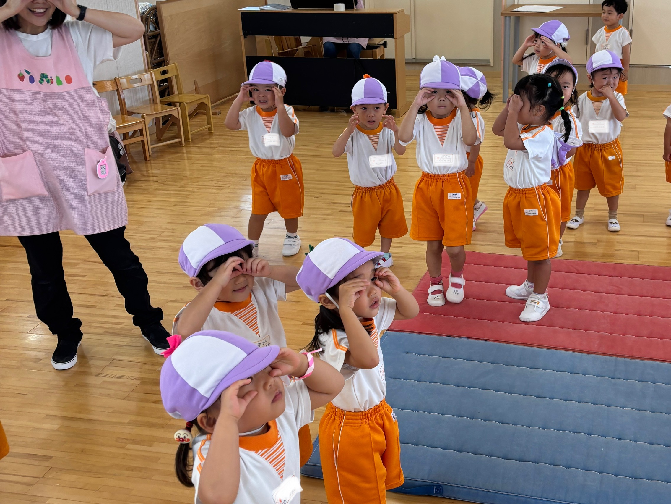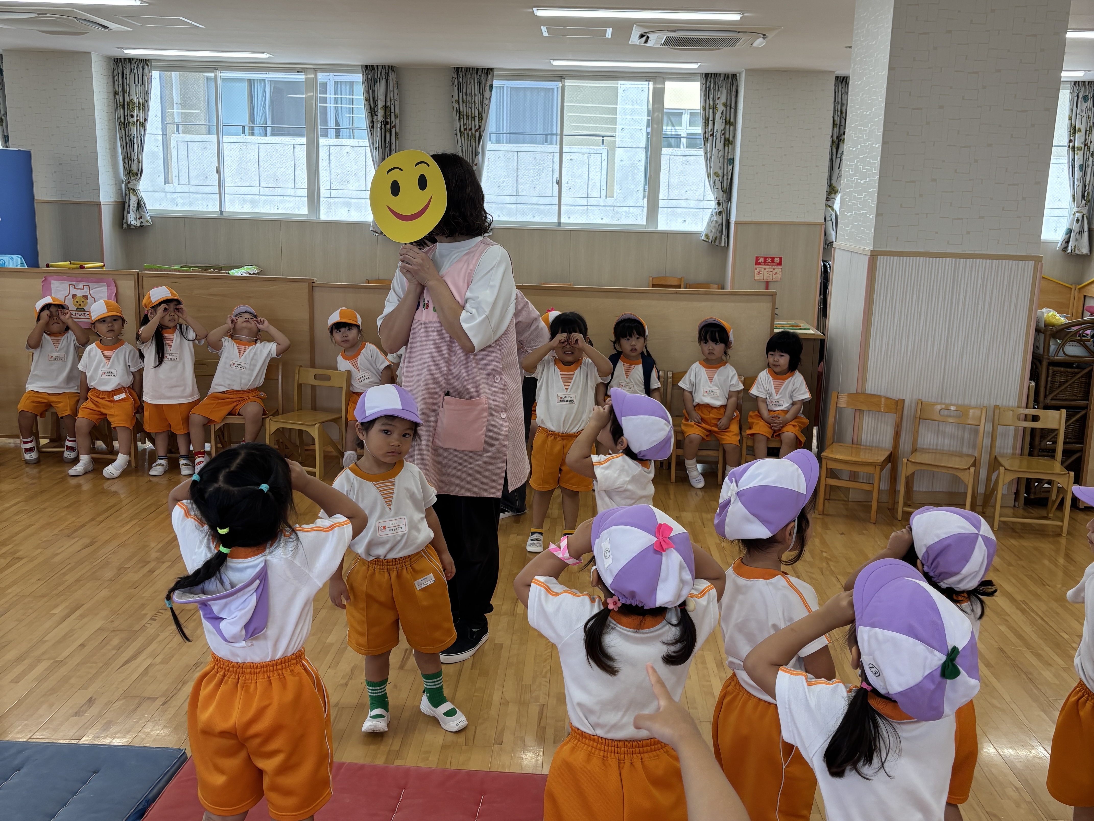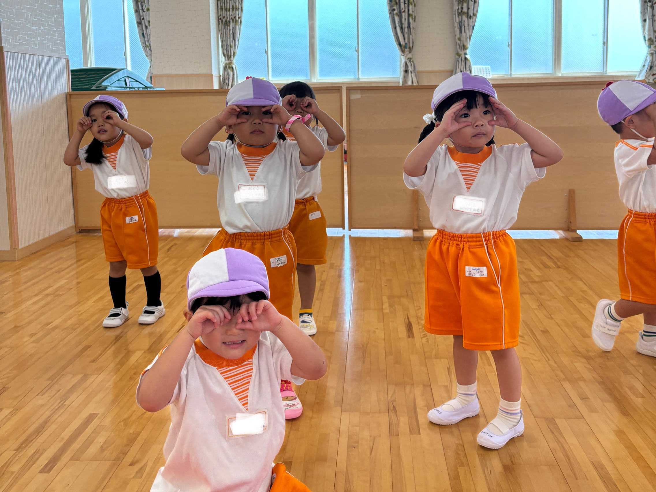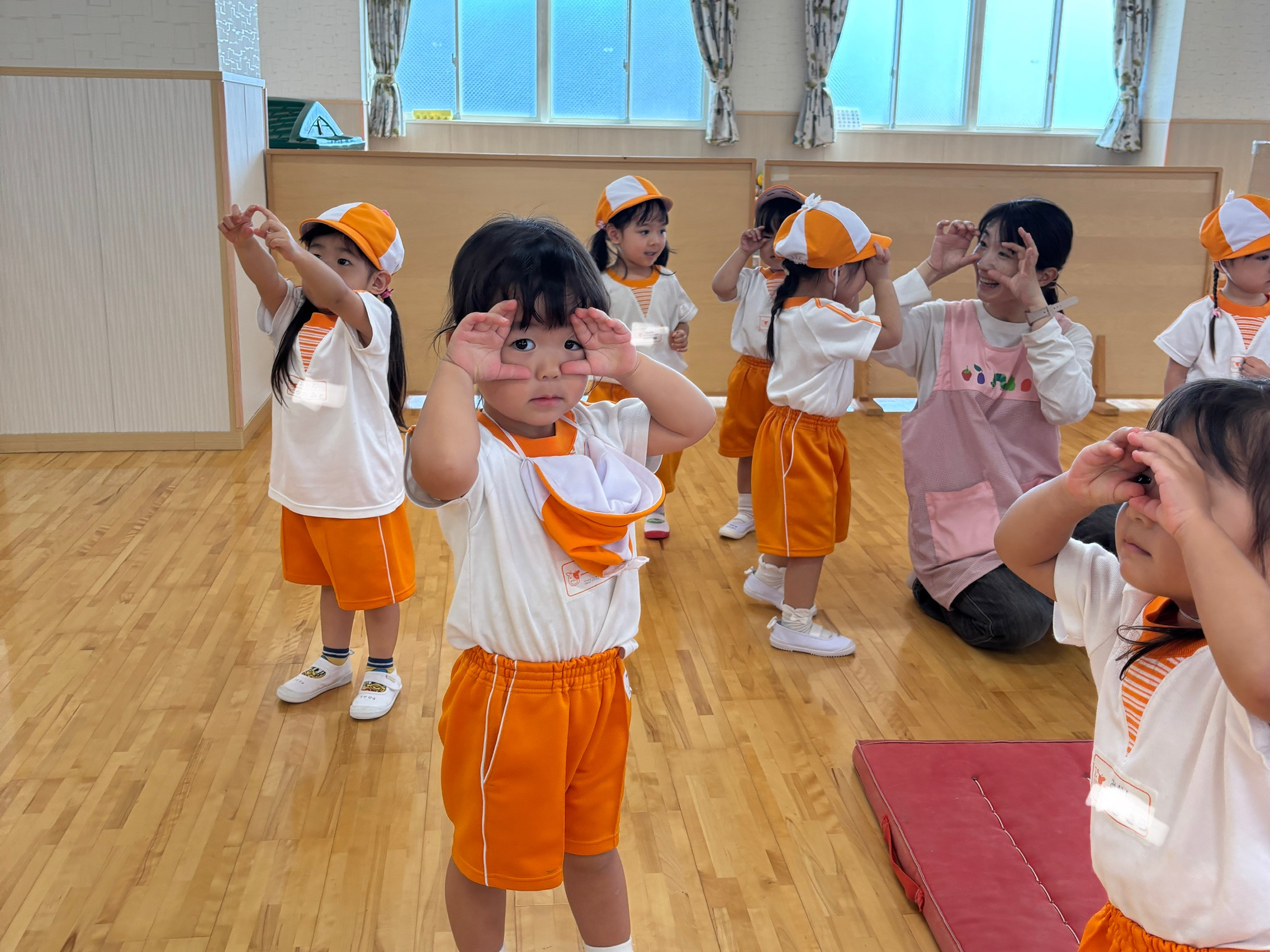 3階の広場で、お月見リトミックをしました。ピアノの音に合わせて歩いたり、止まったりしました。ピアノが止まるとみんなも止まる!という所が楽しいようでした又、素敵なメロディーと共に、お月様が出てきたら、手でめがねを作って見ます。その姿が、可愛らしかったです。